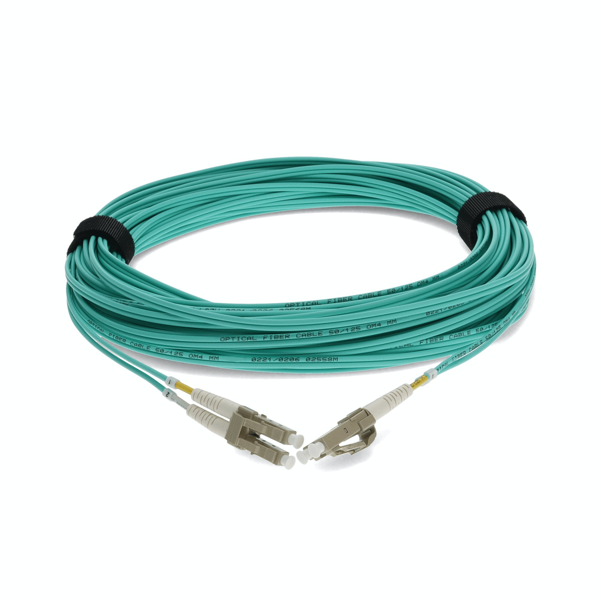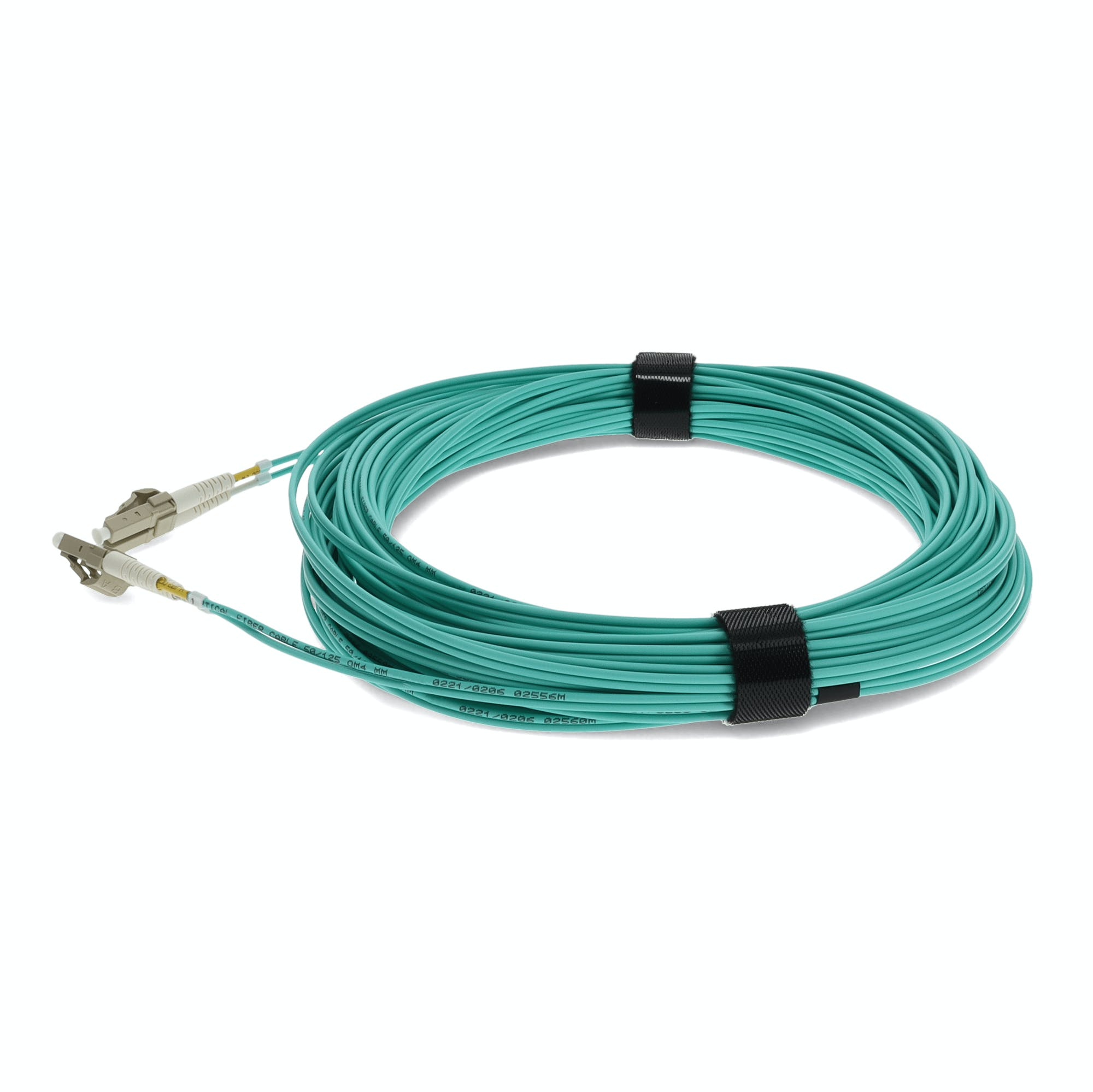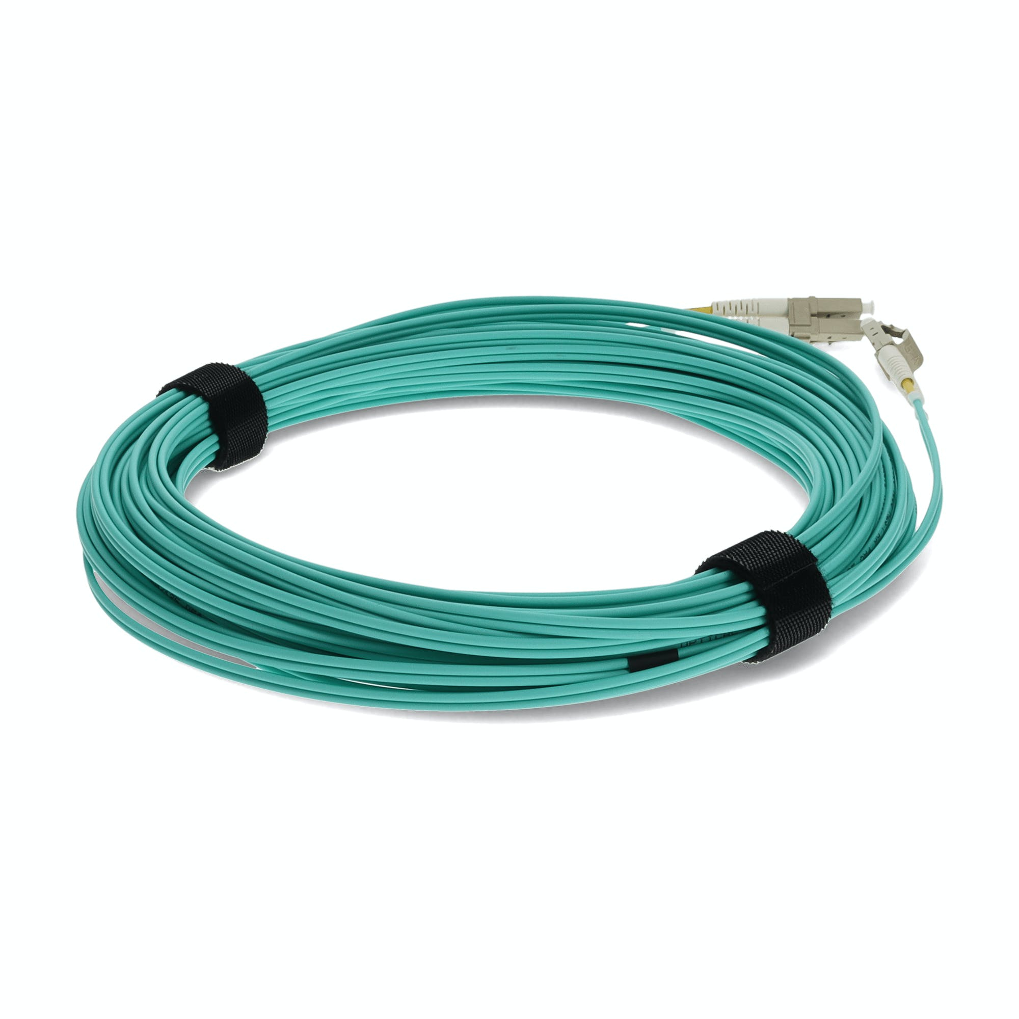 This is a 12m LC (male) to LC (male) aqua duplex riser-rated fiber patch cable. An OM4 cable has a core size of 50m microns that supports 10 Gigabit Ethernet at lengths measuring up to 550 meters, and 100 Gigabit Ethernet measuring up to 150 meters and is reverse compatible with OM3. This optical fiber, nonconductive, riser (OFNR) cable is best suited for use in interior fiber-optic applications. A duplex cable is a two-strand fiber optic patch cable that works best with transceivers that both transmit and receive. Our patch cables are 100% compliant for all of your networking needs. Our products are guaranteed by federal law to not affect or void OEM warranties.