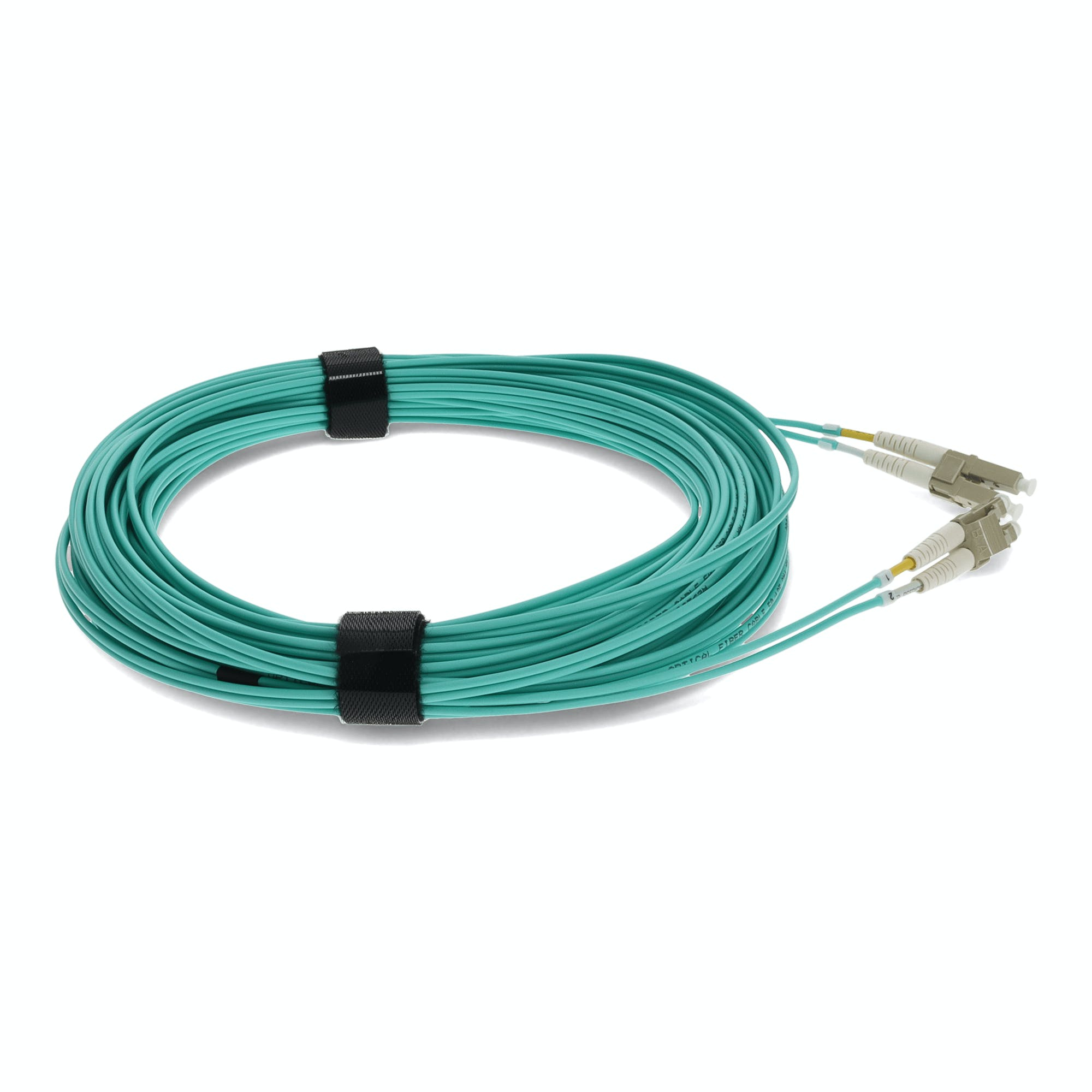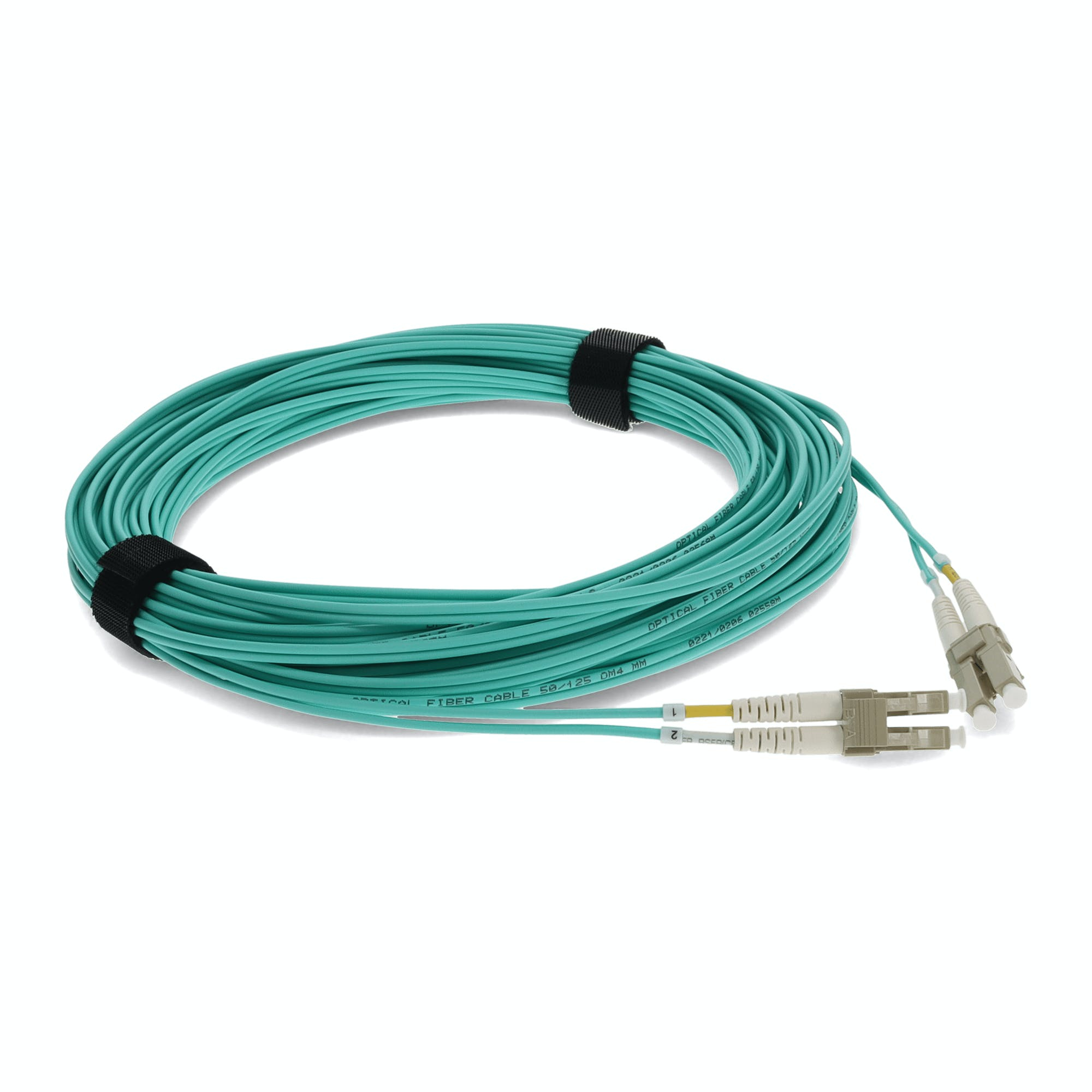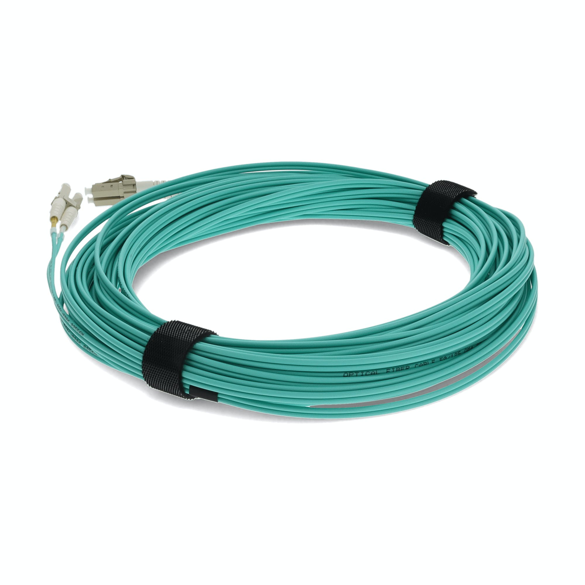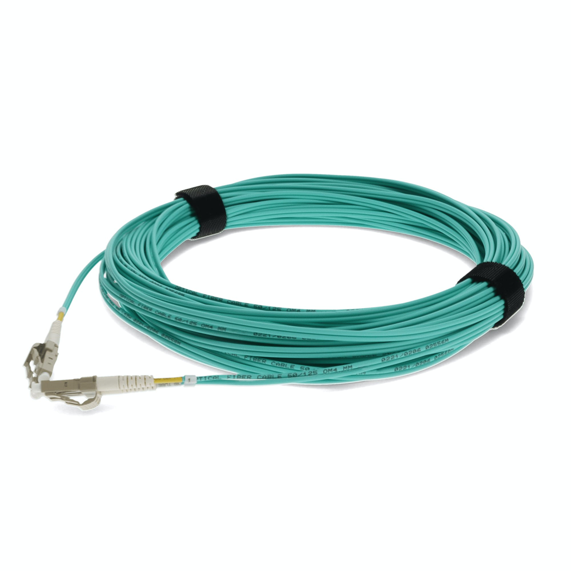 This is a 12m LC (male) to LC (male) aqua duplex riser-rated fiber patch cable. An OM4 cable has a core size of 50m microns that supports 10 Gigabit Ethernet at lengths measuring up to 550 meters, and 100 Gigabit Ethernet measuring up to 150 meters and is reverse compatible with OM3. This optical fiber, nonconductive, riser (OFNR) cable is best suited for use in interior fiber-optic applications. A duplex cable is a two-strand fiber optic patch cable that works best with transceivers that both transmit and receive. Our patch cables are 100% compliant for all of your networking needs. Our products are guaranteed by federal law to not affect or void OEM warranties.