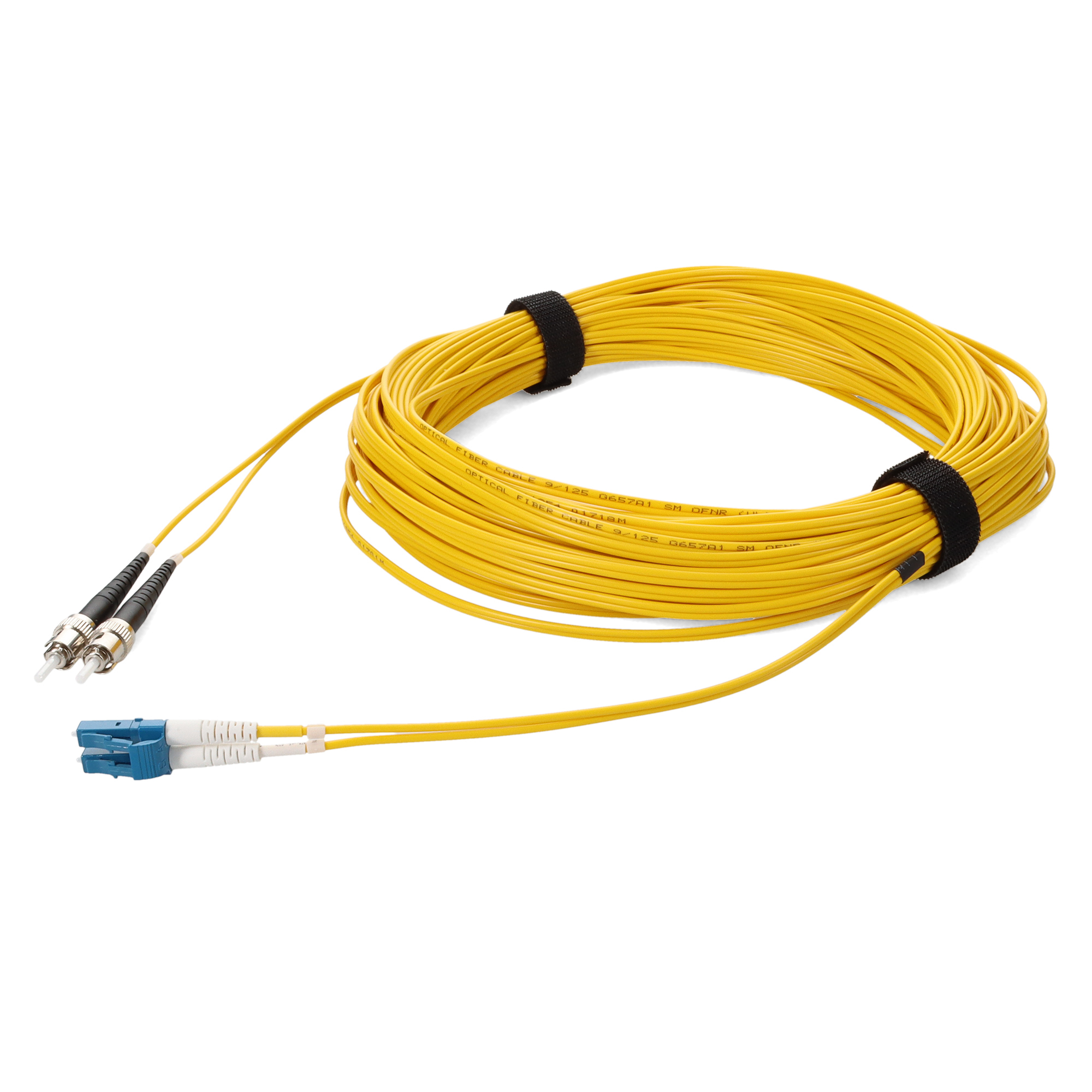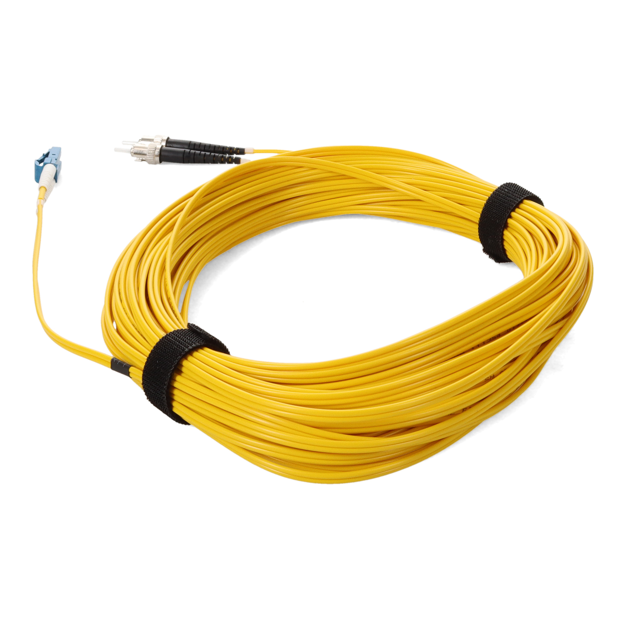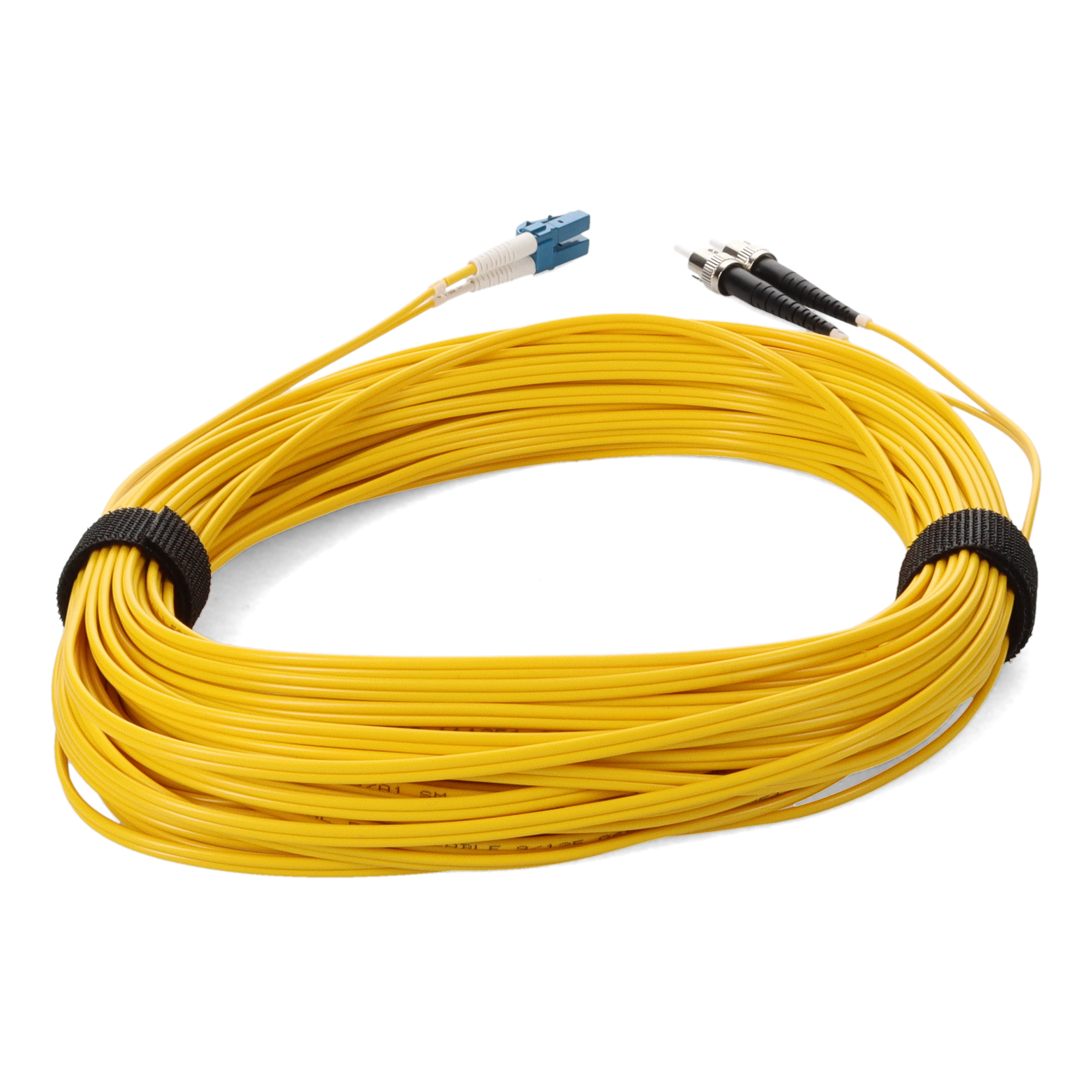 This is a 50m LC (male) to ST (male) yellow duplex riser-rated fiber patch cable. OS2 is a standard single-mode optical fiber commonly used with wavelengths of 1310nm and 1550nm (9/125 microns), and has a maximum attenuation of 1dB/km. The OS2 standard is defined in ISO/IEC 11801. This optical fiber, nonconductive, riser (OFNR) cable is best suited for use in interior fiber-optic applications. A duplex cable is a two-strand fiber optic patch cable that works best with transceivers that both transmit and receive. This patch cable is Trade Agreements Act (TAA) compliant. Our patch cables are 100% compliant for all of your networking needs. Our products are guaranteed by federal law to not affect or void OEM warranties.