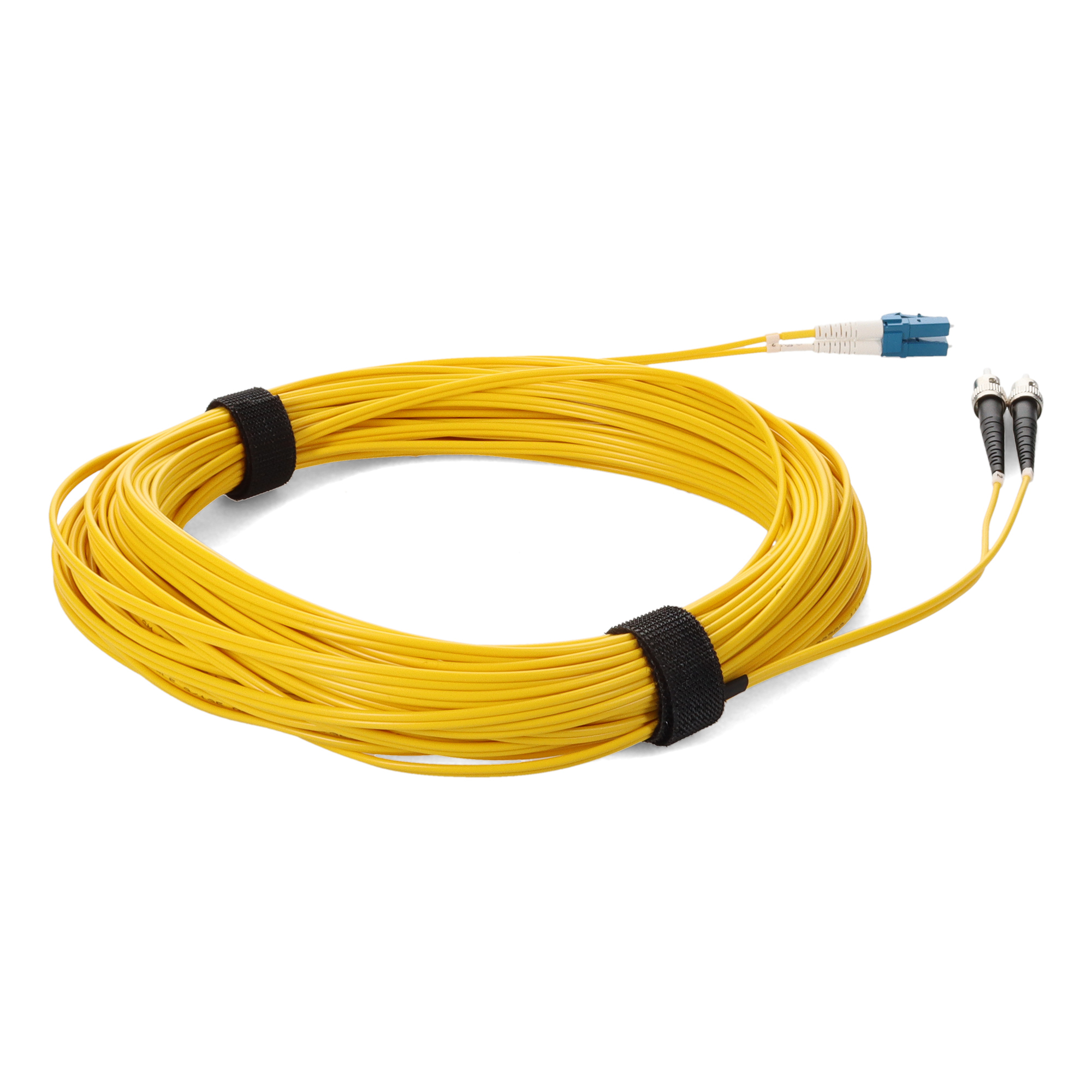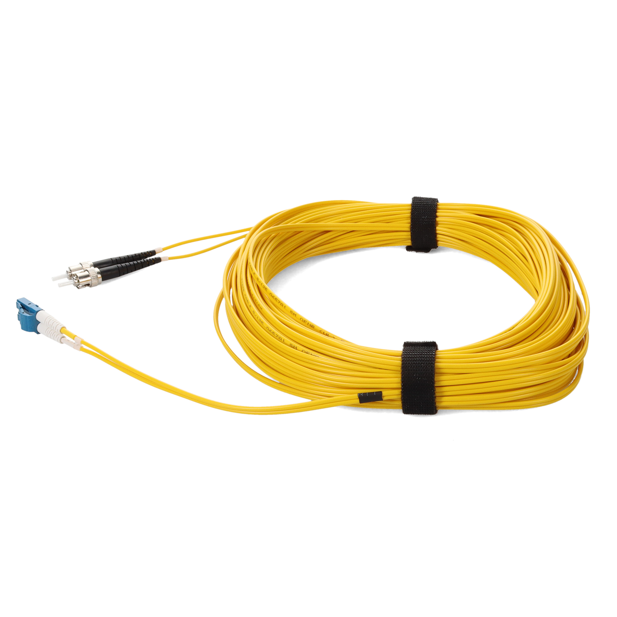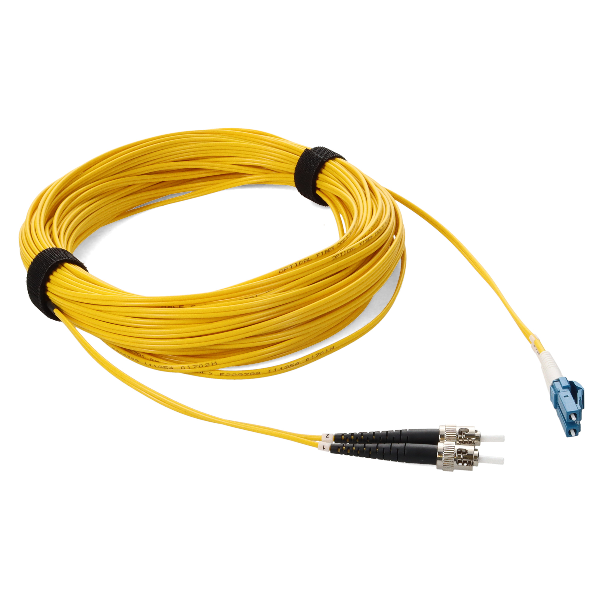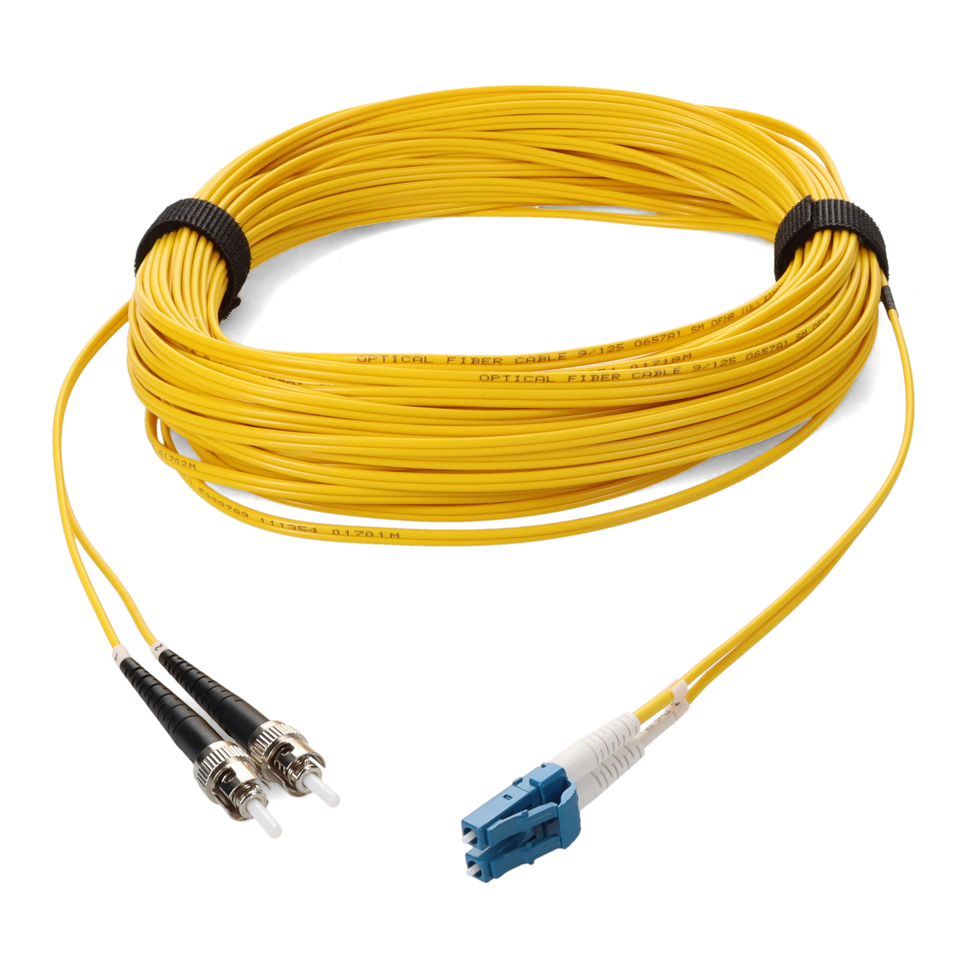 This is a 50m LC (male) to ST (male) yellow duplex riser-rated fiber patch cable. OS2 is a standard single-mode optical fiber commonly used with wavelengths of 1310nm and 1550nm (9/125 microns), and has a maximum attenuation of 1dB/km. The OS2 standard is defined in ISO/IEC 11801. This optical fiber, nonconductive, riser (OFNR) cable is best suited for use in interior fiber-optic applications. A duplex cable is a two-strand fiber optic patch cable that works best with transceivers that both transmit and receive. This patch cable is Trade Agreements Act (TAA) compliant. Our patch cables are 100% compliant for all of your networking needs. Our products are guaranteed by federal law to not affect or void OEM warranties.