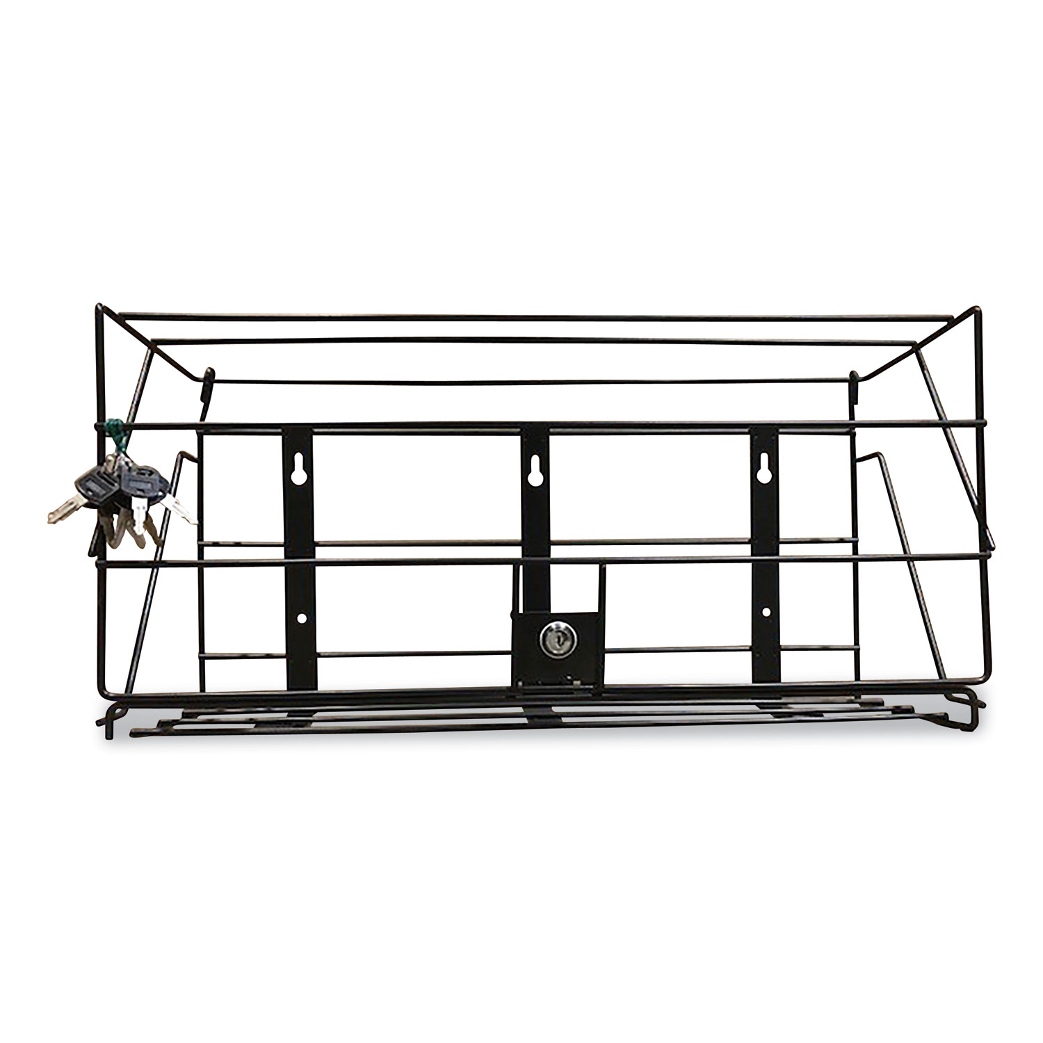 Holds three 3 liter Boardwalk® PDC bottles. Sturdy wire frame. Locking, keys included. Wall mount.
