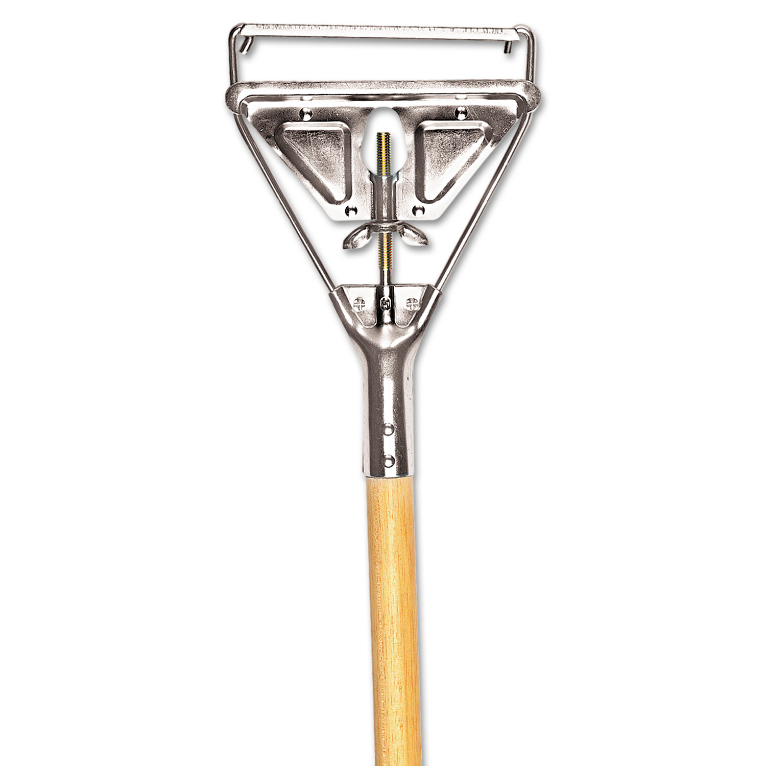 Mop handle offers the flexibility of changing a mop head, but without the hassle. To switch heads, simply slide the side gate open and the handle's thumb wheel clamps the mop firmly in place. Solid wood, slightly lacquered handle with rounded tip for a comfortable grip. Ideal for use with 1-inch headband mops, which are sold separately.