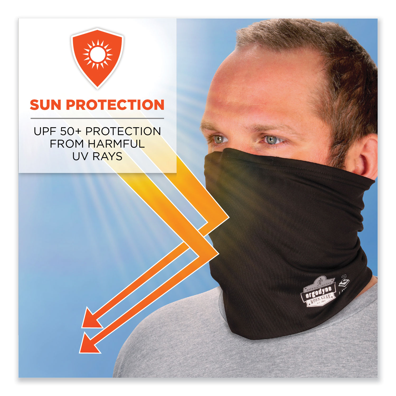 The Chill-Its 6489 2-Layer Cooling Multi-Band meets CDC and WHO recommendations for multiple layers of protection while also shielding the face and neck from sun, dust and flying debris. When worn as a face covering, a nose clip along the top makes for a comfortable and secure fit while also reducing eyewear fogging. Evaporative technology can be easily activated with water for immediate cooling relief. This neck tube is rated to UPF 50+ for protection against the sun's harmful UV rays and features an anti-odor treatment for fresh all-day wear. A reflective accent enhances visibility in low-light conditions. Ideal for anyone requiring two layers of face protection, particularly those who are working or spending excess time in the heat. Simply wet the cooling headwear to activate instant cooling relief that lasts for hours. When activated, this multi-band is lightweight and refreshing for even the hottest days of the year. Machine wash and hang dry as needed. Apparel Type: Multi-Band; Material(s): Polyester; Spandex; Color(s): Black; Color Family: Black.