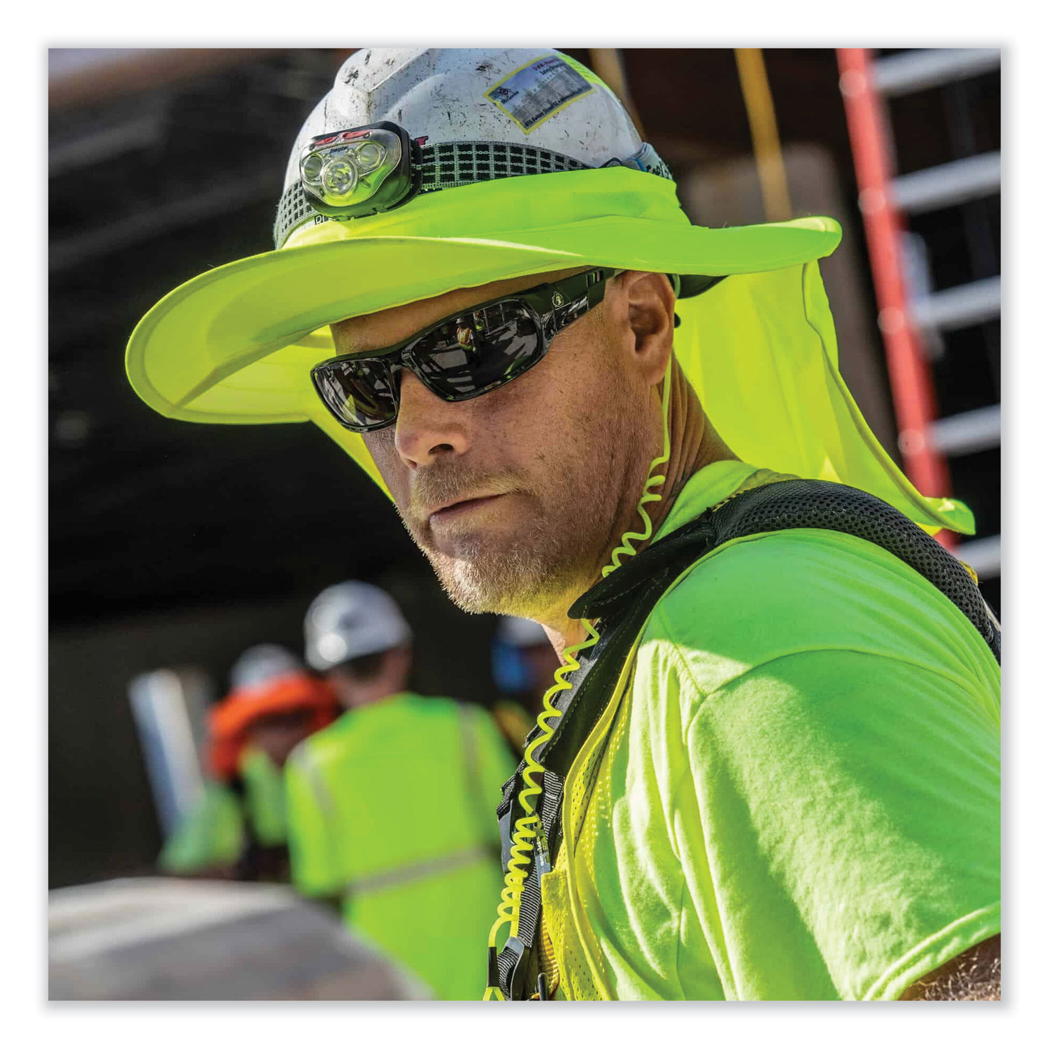 The Chill-Its 6660 Hard Hat Brim with Neck Shade attaches to hard hats to shade the face and neck for protection against sun damage. This full brim shade fits most hard hats, with an elastic rim plus hook and loop attachments for securing to the suspension. A durable plastic ring makes sure the brim holds its shape and a wide panel shade extends down for complete back-of-neck coverage. Hi-vis colors to keep workers safe and seen. Hand wash as needed and hang to dry. Ideal for those working in hot environments where shade is needed, including construction, roofing and landscaping. Safety Headgear Accessory Type: Brim; Neck Shade; Style: Full Brim; Material(s): Polyester; Color(s): Lime.