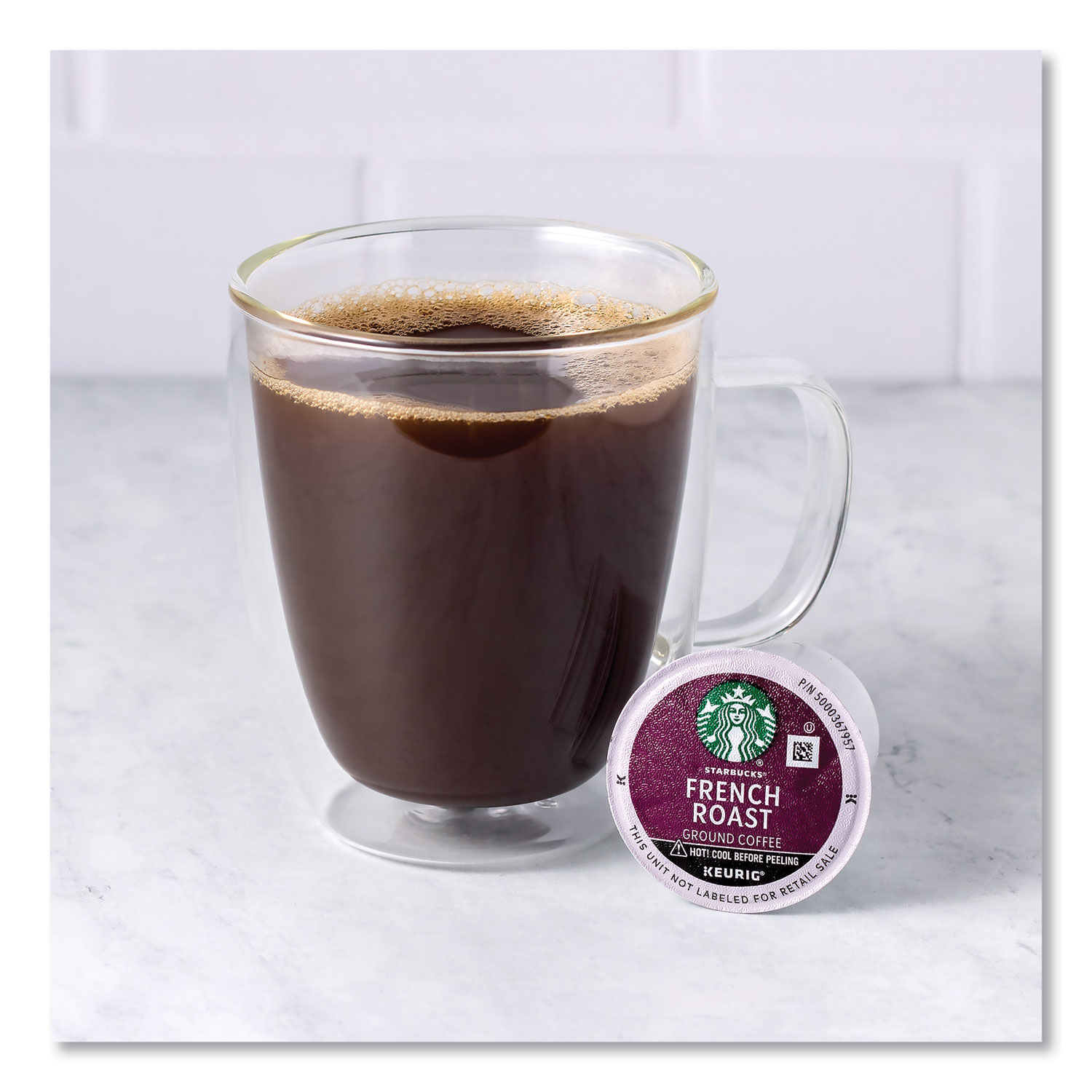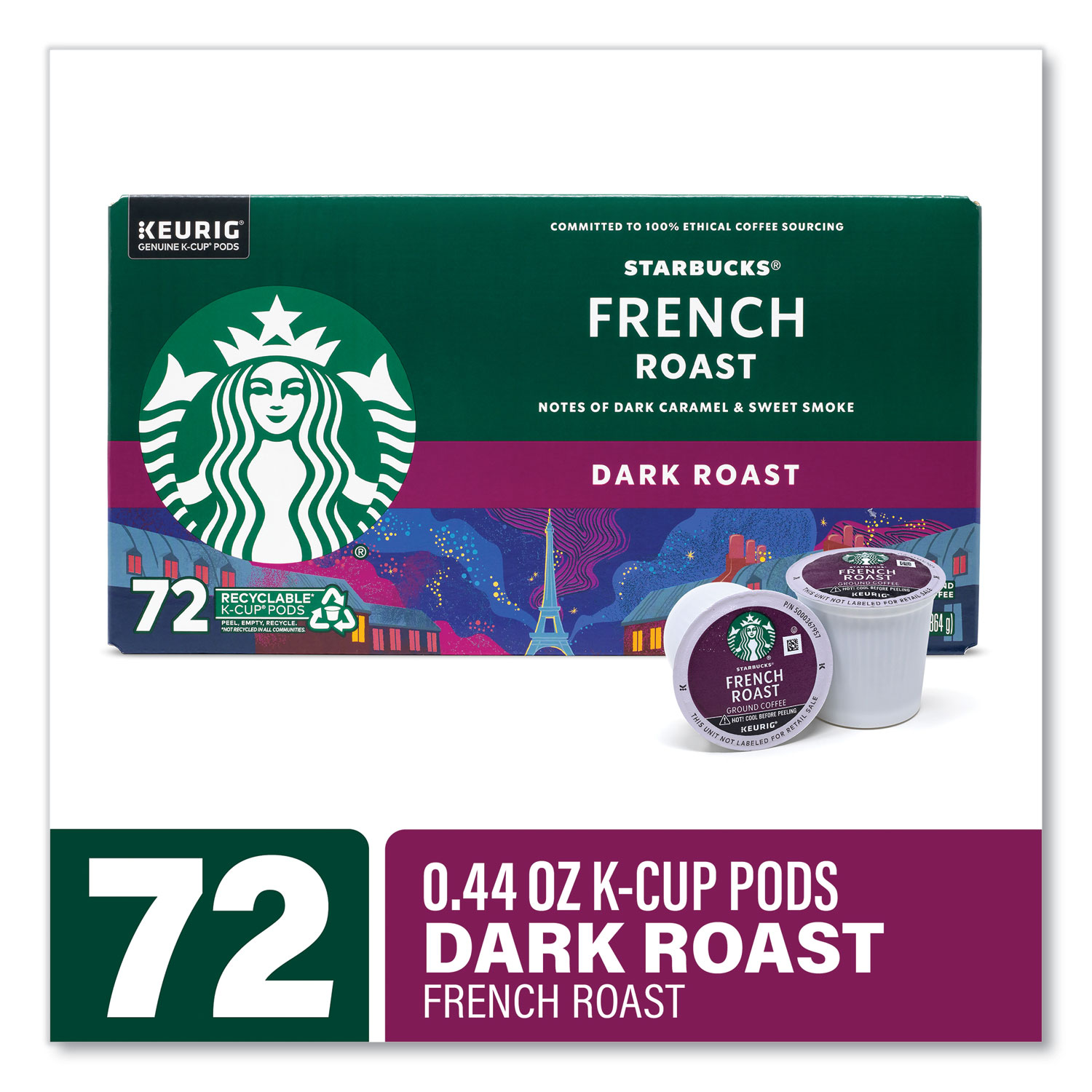 Enjoy a dark roast with intense and smoky flavors—Starbucks® darkest and boldest and not for the faint of heart. It starts with high-quality beans, which can withstand the intense fires that make French Roast what it is, that are then roasted to their edge. The result is a delectably smoky cup, with intense and uncompromising flavor. Convenient K-Cups® are designed for the Keurig® brewing system. Beverage Type: Coffee; Flavor: French Roast; Roast Type: Dark; Product Packaging: K-Cup®.