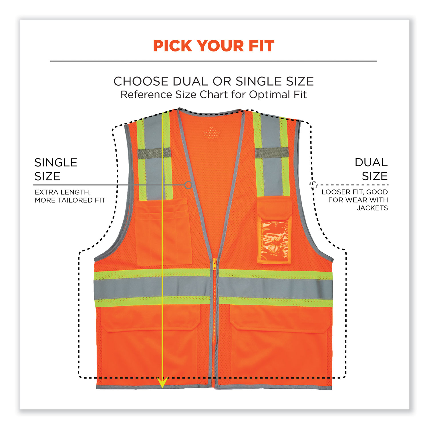 The GloWear 8246Z-S Mesh Two-Tone Hi-Vis Safety Vest is an ANSI 107 Type R, Class 2 vest made of 3.3oz polyester mesh. This hi-vis vest features 2" reflective tape set on a 3.5" contrasting mesh background and reflective piping for enhanced low-light visibility. Built for storage, this vest has two inside and four outside pockets, a clear ID badge holder and dual radio mic tabs. A zipper closure makes for easy on and off. This vest is available in single sizes to allow workers to order their exact size for a more tailored, performance-style fit compared to dual-size vests (tip: for best single-size fit, select one size down from your normal T-shirt size). This reflective safety vest is ideal for anyone requiring Type R, Class 2 apparel, including road construction, baggage handling and municipalities. Apparel Type: Safety Vest; Material(s): Polyester; Color(s): Orange; Color Family: Orange.