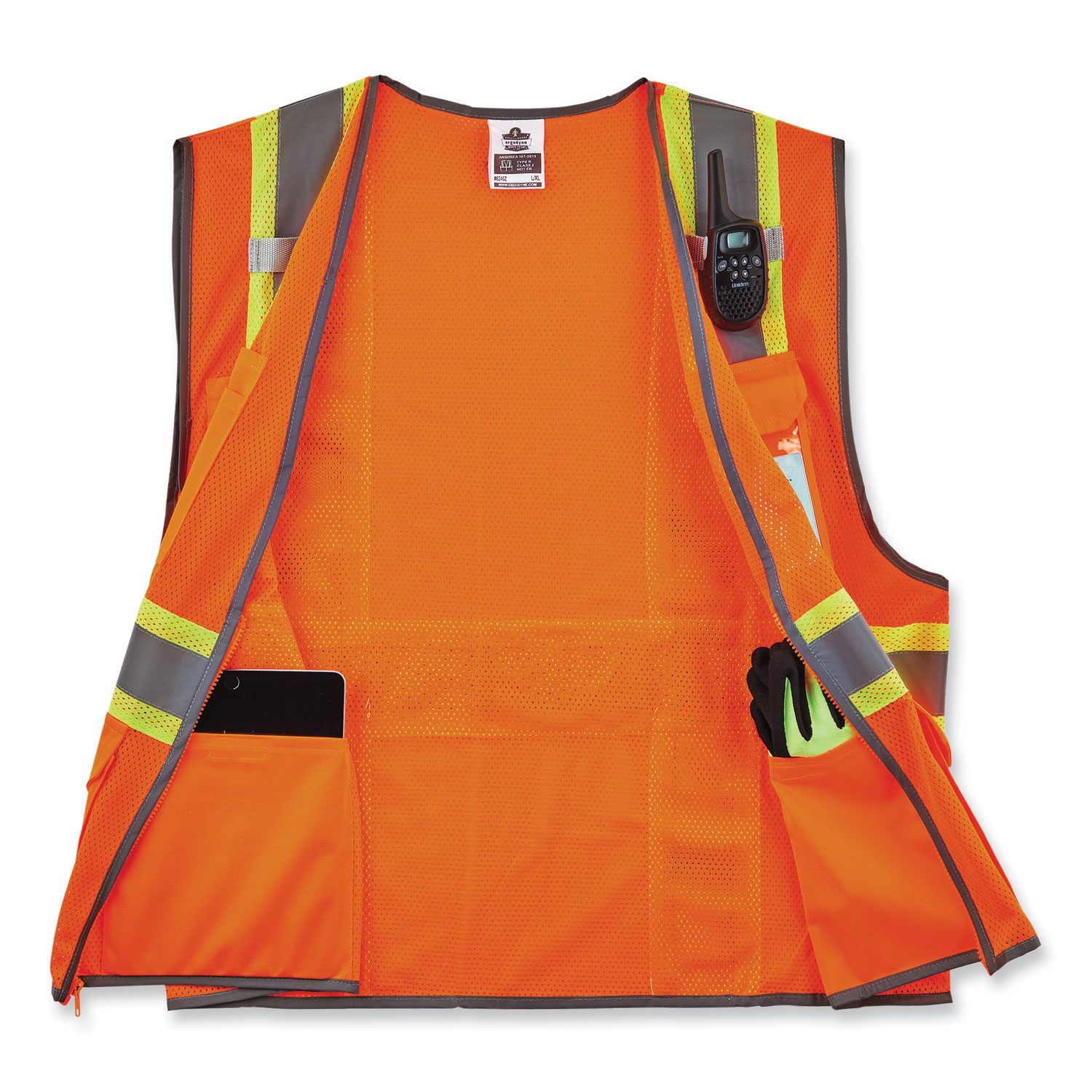 The GloWear 8246Z-S Mesh Two-Tone Hi-Vis Safety Vest is an ANSI 107 Type R, Class 2 vest made of 3.3oz polyester mesh. This hi-vis vest features 2" reflective tape set on a 3.5" contrasting mesh background and reflective piping for enhanced low-light visibility. Built for storage, this vest has two inside and four outside pockets, a clear ID badge holder and dual radio mic tabs. A zipper closure makes for easy on and off. This vest is available in single sizes to allow workers to order their exact size for a more tailored, performance-style fit compared to dual-size vests (tip: for best single-size fit, select one size down from your normal T-shirt size). This reflective safety vest is ideal for anyone requiring Type R, Class 2 apparel, including road construction, baggage handling and municipalities. Apparel Type: Safety Vest; Material(s): Polyester; Color(s): Orange; Color Family: Orange.