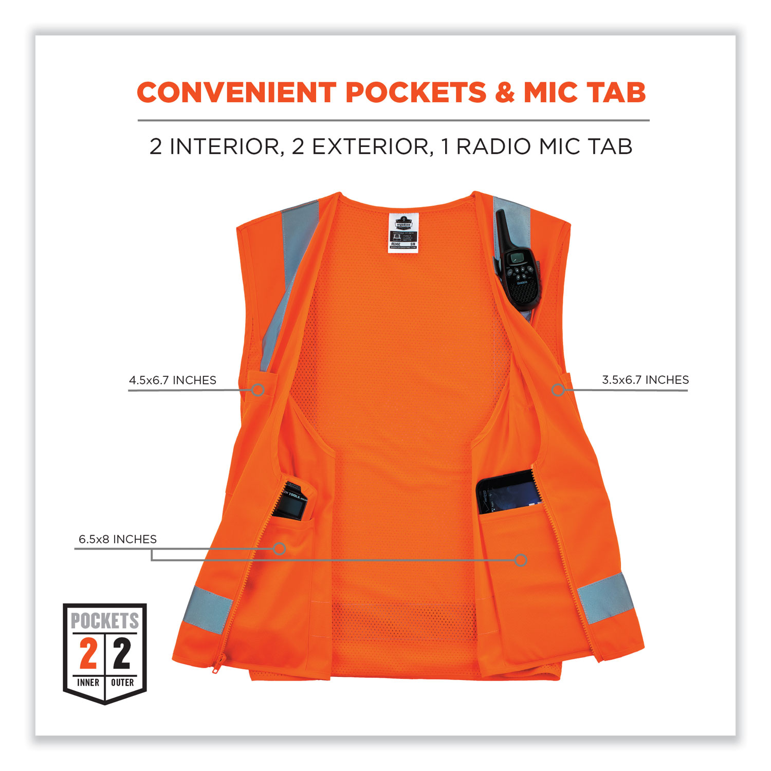 The GloWear 8249Z-S Hi-Vis Surveyors Vest is an ANSI 107 Type R, Class 2 vest with a 3.6 oz polyester solid front and breathable 3.3 oz polyester mesh back. This hi-vis vest features 2" reflective tape for enhanced low-light visibility. With two interior and two exterior pockets, including a cell phone chest pocket, this vest provides ample storage for pens, notebooks, tablets and more. A single mic tab allows convenient radio access, and a zipper closure makes for easy on and off. This vest is available in single sizes to allow workers to order their exact size for a more tailored, performance-style fit compared to dual-size vests (tip: for best fit, select one size down from your normal T-shirt size). This reflective safety vest is ideal for anyone requiring Type R, Class 2 apparel. Apparel Type: Safety Vest; Material(s): Polyester; Color(s): Orange; Color Family: Orange.