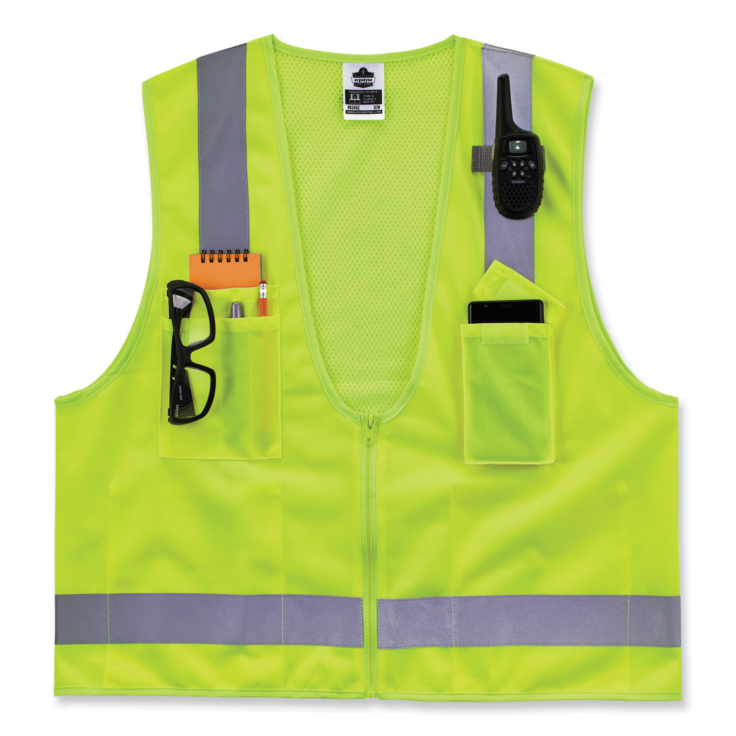The GloWear 8249Z-S Hi-Vis Surveyors Vest is an ANSI 107 Type R, Class 2 vest with a 3.6 oz polyester solid front and breathable 3.3 oz polyester mesh back. This hi-vis vest features 2" reflective tape for enhanced low-light visibility. With two interior and two exterior pockets, including a cell phone chest pocket, this vest provides ample storage for pens, notebooks, tablets and more. A single mic tab allows convenient radio access, and a zipper closure makes for easy on and off. This vest is available in single sizes to allow workers to order their exact size for a more tailored, performance-style fit compared to dual-size vests (tip: for best fit, select one size down from your normal T-shirt size). This reflective safety vest is ideal for anyone requiring Type R, Class 2 apparel. Apparel Type: Safety Vest; Material(s): Polyester; Color(s): Lime; Color Family: Green.