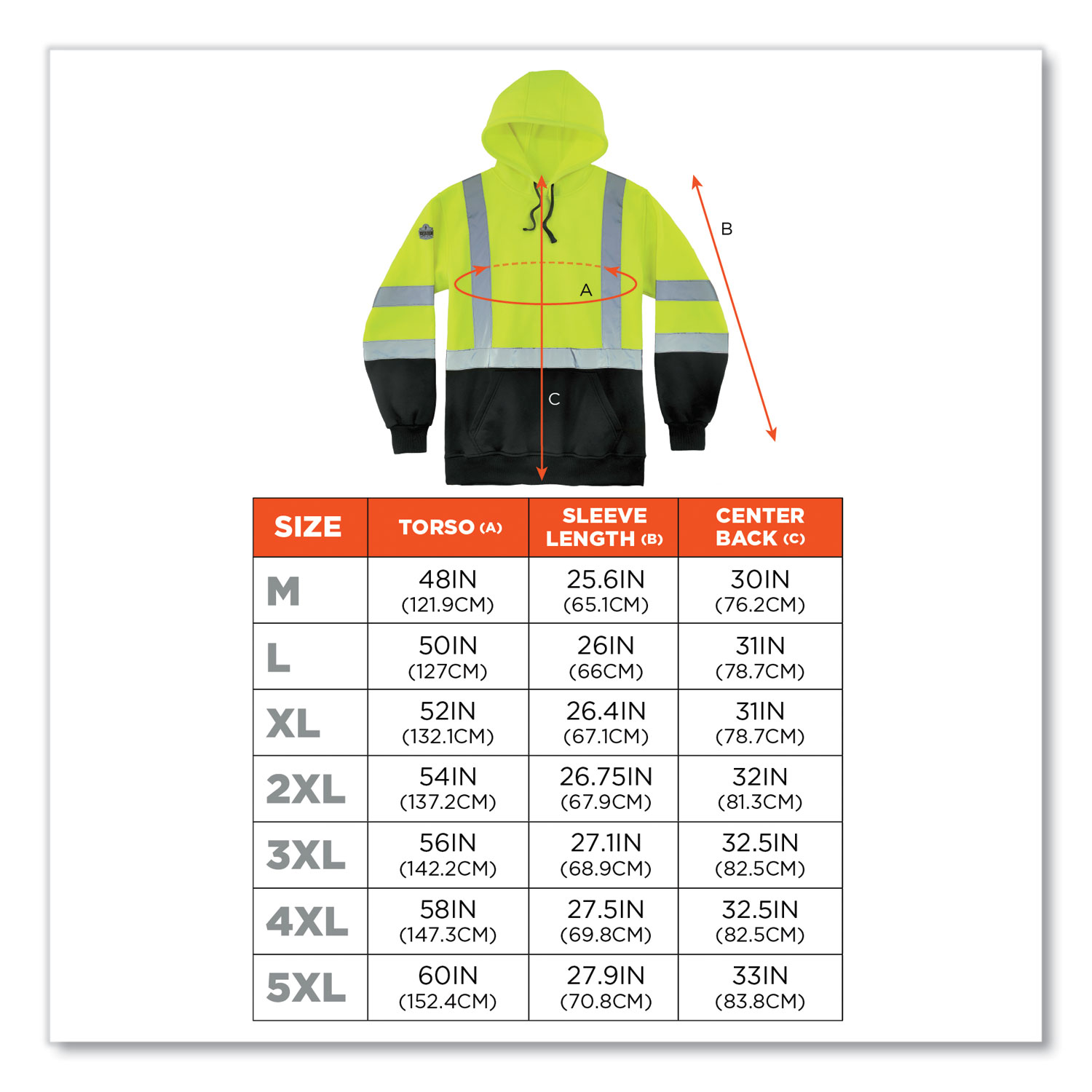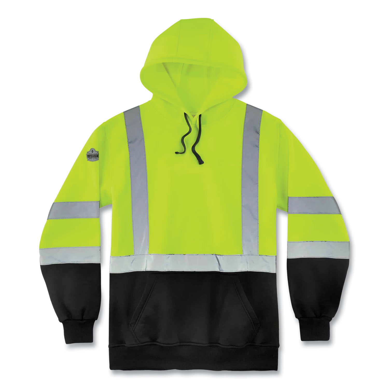The GloWear 8373 Hi-Vis Pullover Hoodie with Black Bottom meets ANSI/ISEA 107-2015 Type R, Class 3 Standards for safety and is designed with high-quality 100% polyester polar fleece to provide conspicuity and warmth during chilly days. This safety sweatshirt has a pouch-style pocket great for additional hand warmth and storage. The bottom front and wrist sections of the sweatshirt are black to prevent a dirty look where it matters most. The contrasting high visibility yellow/lime color provides ultimate visibility. There is 2" ANSI-compliant silver reflective tape on the torso, shoulders and sleeves making it a great reflective hoodie to wear as night falls for effective visibility. The drawstring hood and elastic knit waistband and cuffs keep the heat in for all-day warmth throughout the workday. It is perfect for jobsites in high-traffic areas like road construction or anywhere that requires high visibility clothing. Apparel Type: Hi-Vis Shirt; Material(s): Polar Fleece; Color(s): Lime; Color Family: Green.