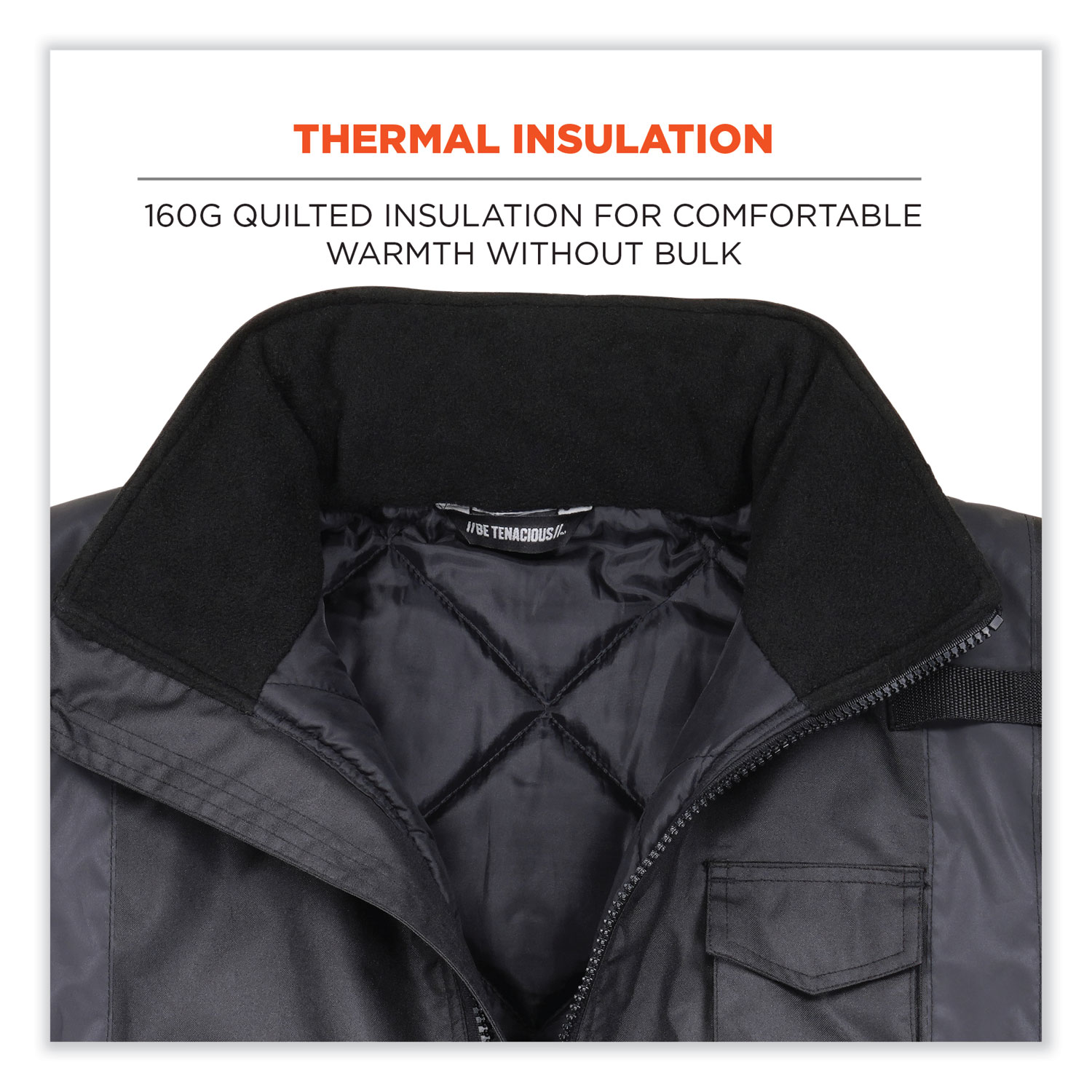 The GloWear 8377EV Thermal Enhanced High Visibility Jacket is designed with a polyester outer shell + PU coating for water- and wind-resistant protection from the elements, plus 160 g thermal quilted insulation for comfortable no-bulk warmth. With unique 2" black reflective tape set on black fabric, this jacket maintains a low-profile look in the daytime while enhancing visibility at night or in low-light conditions. The adjustable inset hood features drawstrings and stoppers for a custom fit, and can easily be zipped in or out depending on weather conditions or personal preference. Adjustable hook and loop cuffs seal out cold and allow for comfortable wear with gloves. A full front zippered closure makes for easy on and off. This work jacket features two lower front pockets, one upper chest cell phone pocket, one dual slot pen pocket and two mic tabs for convenient access and storage. Apparel Type: Hi-Vis Jacket; Material(s): Polyester; Color(s): Black; Color Family: Black.