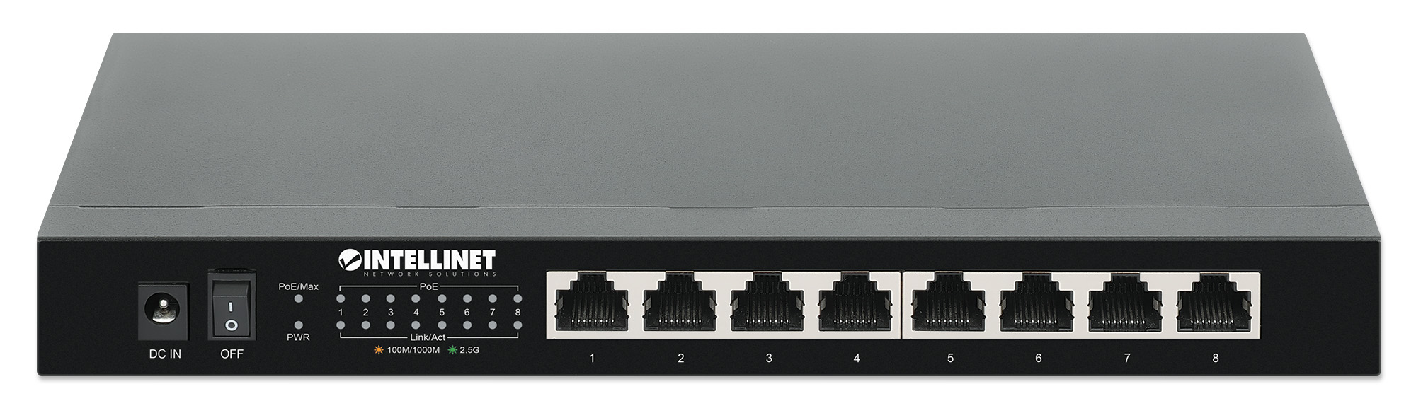 The 8-Port 2.5G Ethernet Unmanaged PoE+ Switch from Intellinet Network Solutions passes both data and electrical power to a number of PoE-compatible devices via standard Cat5e or Cat6 network cables. Equipped with eight multi-gigabit Ethernet PoE+ copper ports, this Switch can power wireless LAN bridges, VoIP phones and more while delivering network speeds up to 2500 Mbps.