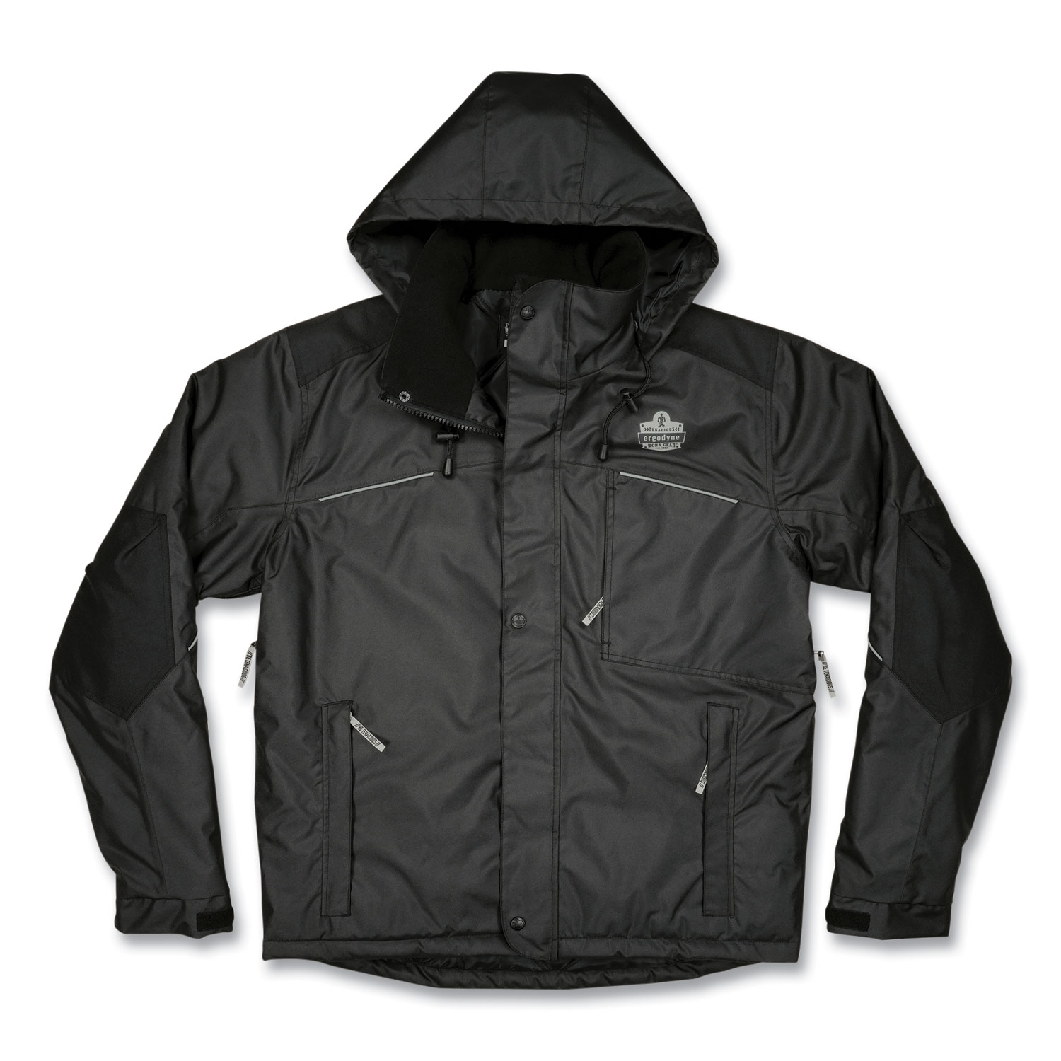 The N-Ferno 6467 Winter Work Jacket is built for warm and durable protection in cold environments. The 300D polyester oxford with breathable water-repellent coating protects from the elements, while thermal insulation and quilted sleeves keep workers comfortably warm. This work jacket features a removable hood that can easily be snapped on or off depending on weather conditions or personal preference. For a snug and custom fit that keeps cold air out, it features adjustable hook and loop cuffs, drawstring hood, drawstring waist and a long tail that won't ride up. The adjustable cuffs plus heavy-duty zippered closure also make for easy on and off with gloves. One exterior chest pocket and one interior pocket (both fit larger smartphones), plus two lower-front pockets for convenient storage. Reflective accents keep workers safe and seen. This winter work jacket is ideal for those who work in cold environments where hi-vis is not required. Apparel Type: Thermal Jacket; Material(s): Polyester; Color(s): Black; Color Family: Black.
