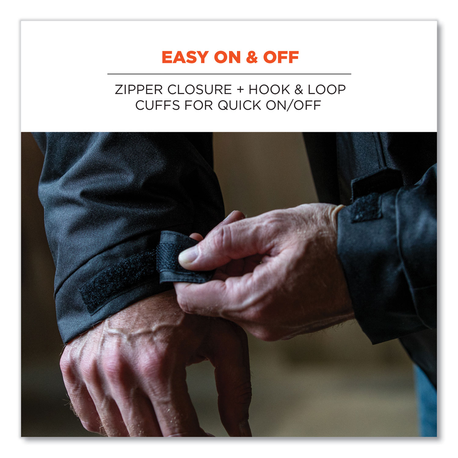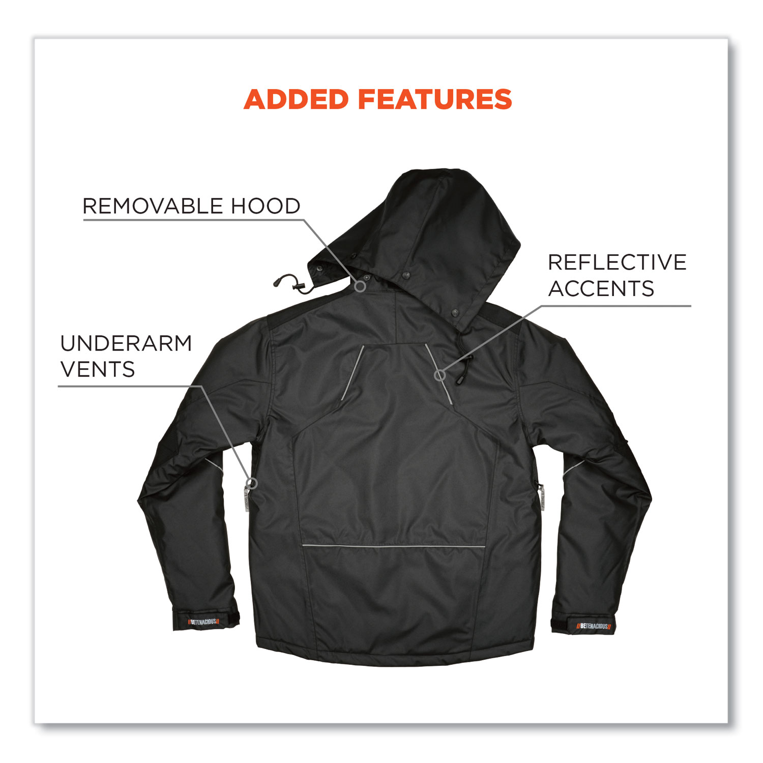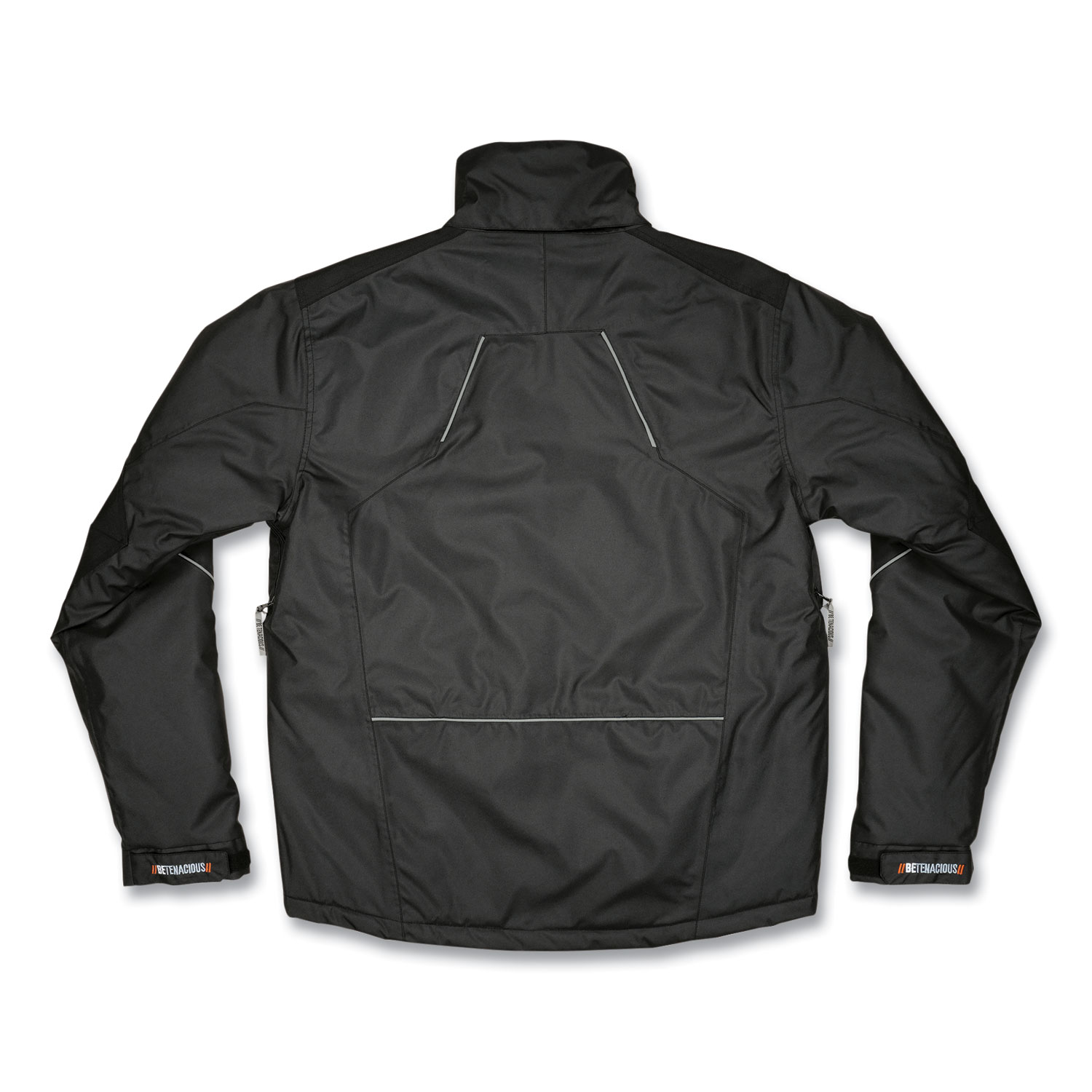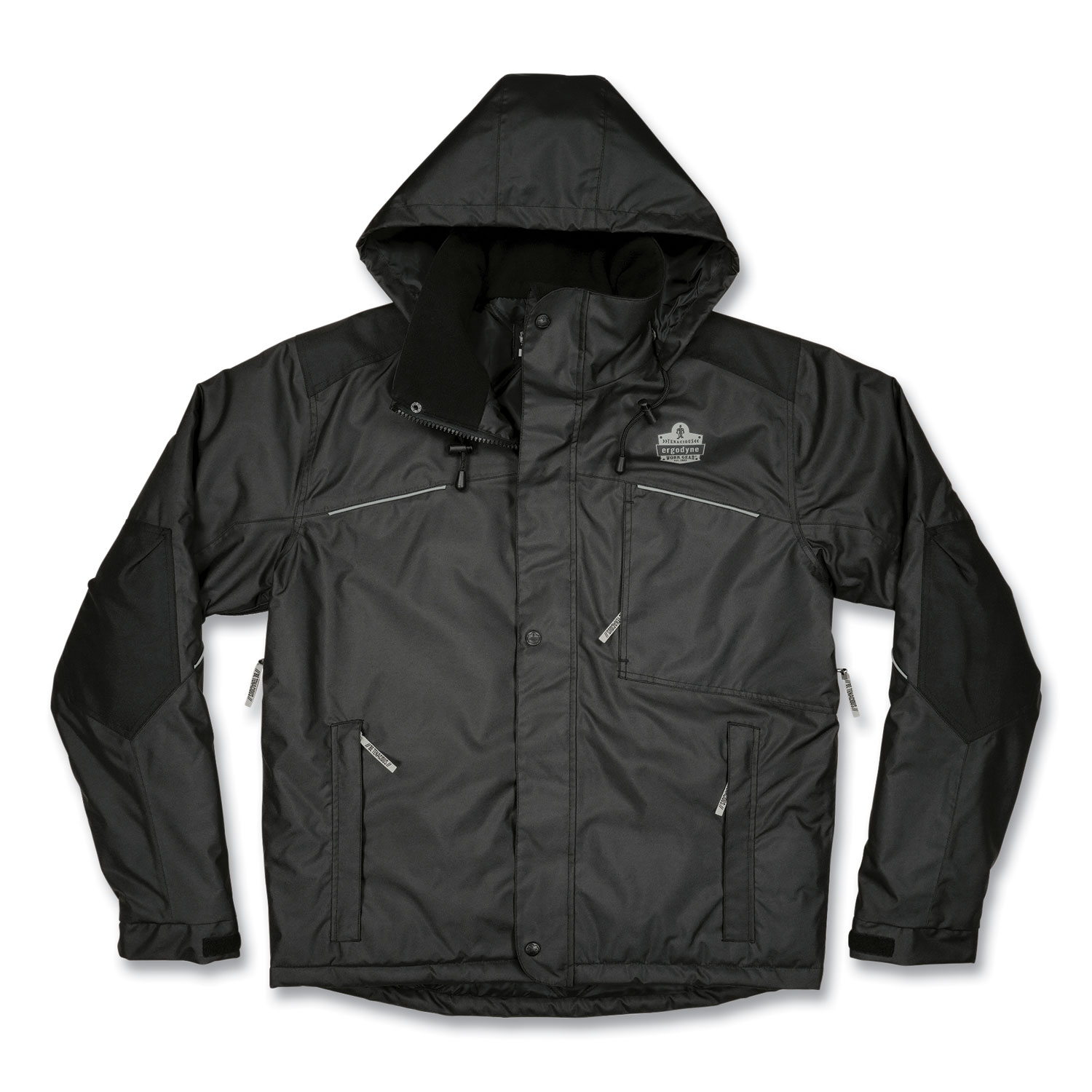 The N-Ferno 6467 Winter Work Jacket is built for warm and durable protection in cold environments. The 300D polyester oxford with breathable water-repellent coating protects from the elements, while thermal insulation and quilted sleeves keep workers comfortably warm. This work jacket features a removable hood that can easily be snapped on or off depending on weather conditions or personal preference. For a snug and custom fit that keeps cold air out, it features adjustable hook and loop cuffs, drawstring hood, drawstring waist and a long tail that won't ride up. The adjustable cuffs plus heavy-duty zippered closure also make for easy on and off with gloves. One exterior chest pocket and one interior pocket (both fit larger smartphones), plus two lower-front pockets for convenient storage. Reflective accents keep workers safe and seen. This winter work jacket is ideal for those who work in cold environments where hi-vis is not required. Apparel Type: Thermal Jacket; Material(s): Polyester; Color(s): Black; Color Family: Black.