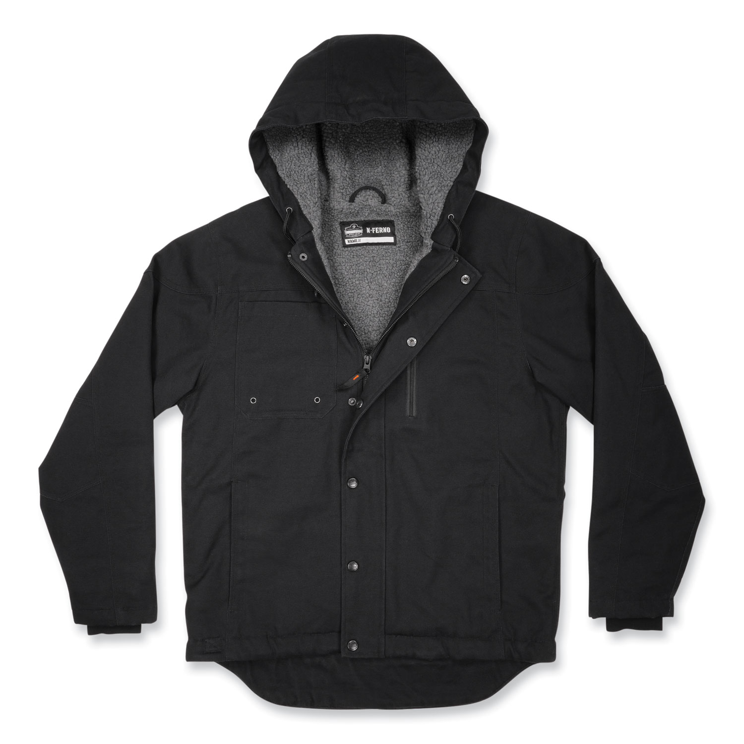 The N-Ferno 6468 Heavy-Duck Canvas Work Jacket is a rugged midweight jacket for warmth in cool conditions. The cotton duck canvas features a wind- and water-resistant DWR finish for long-lasting durability and dry all-day wear. The body and hood are lined with warm and comfortable sherpa, while the flexible gusseted sleeves feature 40 gm quilted insulation for warmth without compromised mobility. For a snug and custom fit that keeps cold air out, this canvas work jacket features rib knit cuffs, an elastic bungee waist, drawstring hood and a long tail that won't ride up. Built for the job, the hood is large enough to be pulled up over hard hats. A zippered closure with snap buttons makes for easy on and off. This sherpa-lined canvas jacket features six pockets for convenient storage. Apparel Type: Thermal Jacket; Material(s): Canvas; Color(s): Black; Color Family: Black.