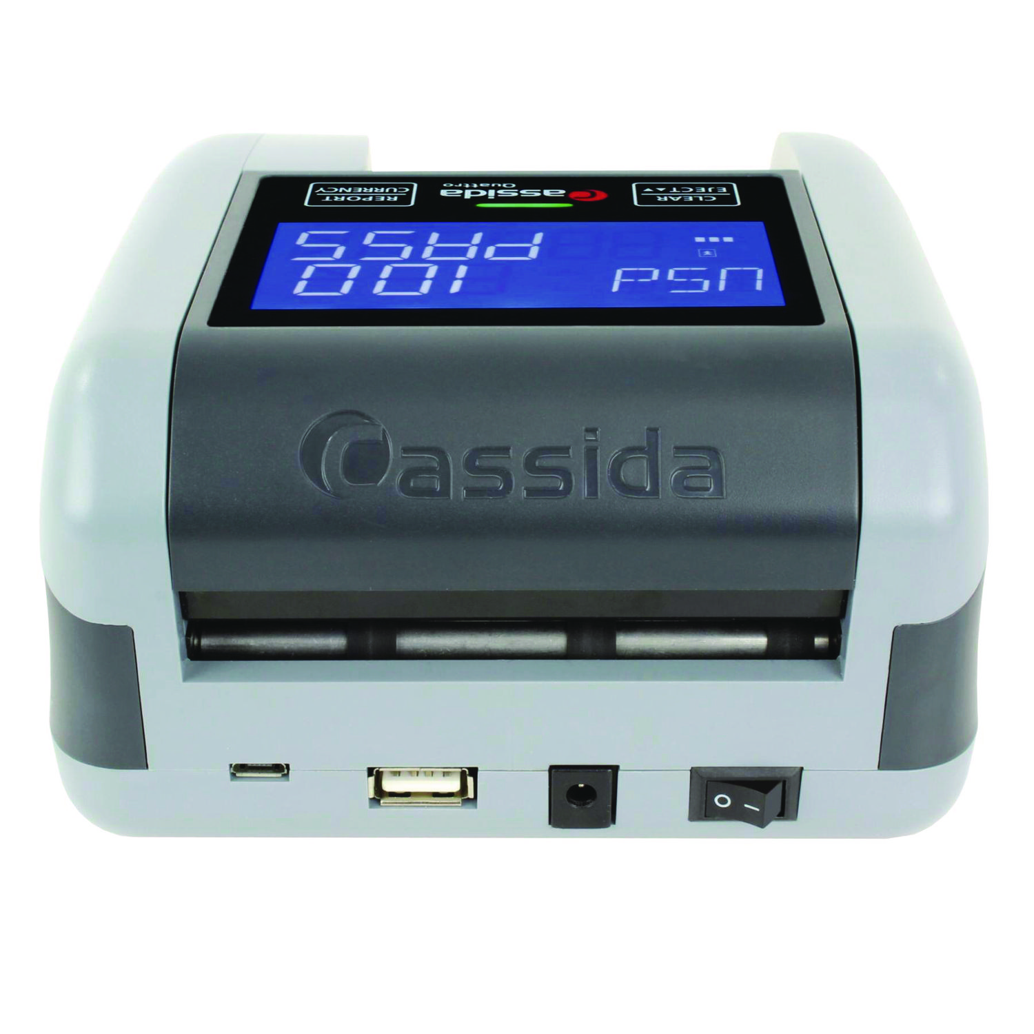 Cassida Quattro is a reliable and user-friendly fake money detector for busy cash businesses. It accepts bills in any orientation and instantly confirms if it's real or fake. The display shows the bill's value and status, avoiding errors due to incorrect insertion. The Quattro uses Cassida's M Algorithm for detection, providing accurate and dependable protection with few false rejects. Cassida's Counterfeit Shield guarantees to repay any fake bills that pass through the Quattro. The Quattro is easy to upgrade and has a rechargeable battery, making it portable and convenient for crowded events. Choose Cassida for dependable and efficient counterfeit detection. Counterfeit Bill Detector Type: Infrared; Magnetic Strip Detection; Magnetic Thread Security; UV Light; Currency: U.S.; Color(s): Gray; Width: 4.9".